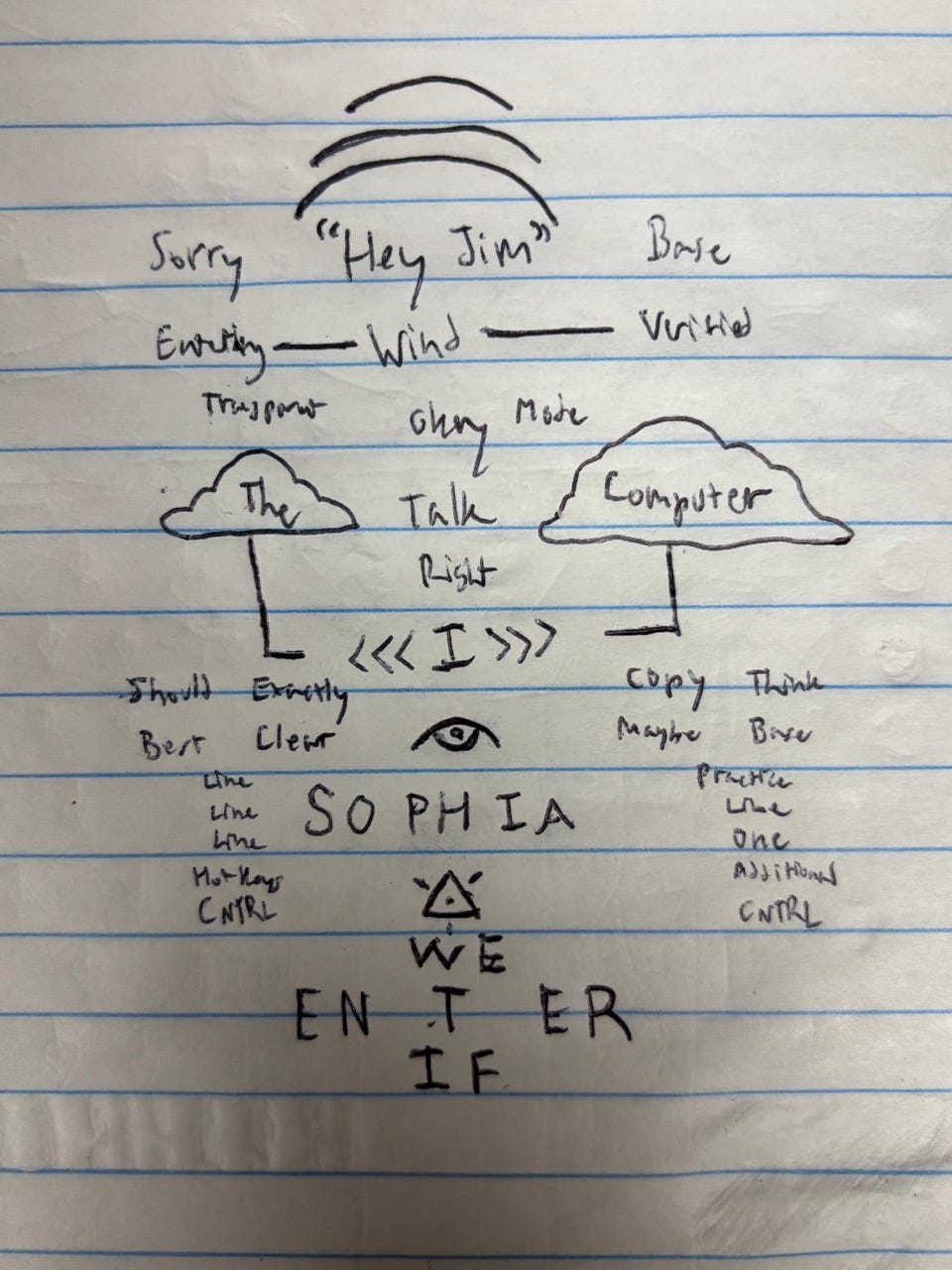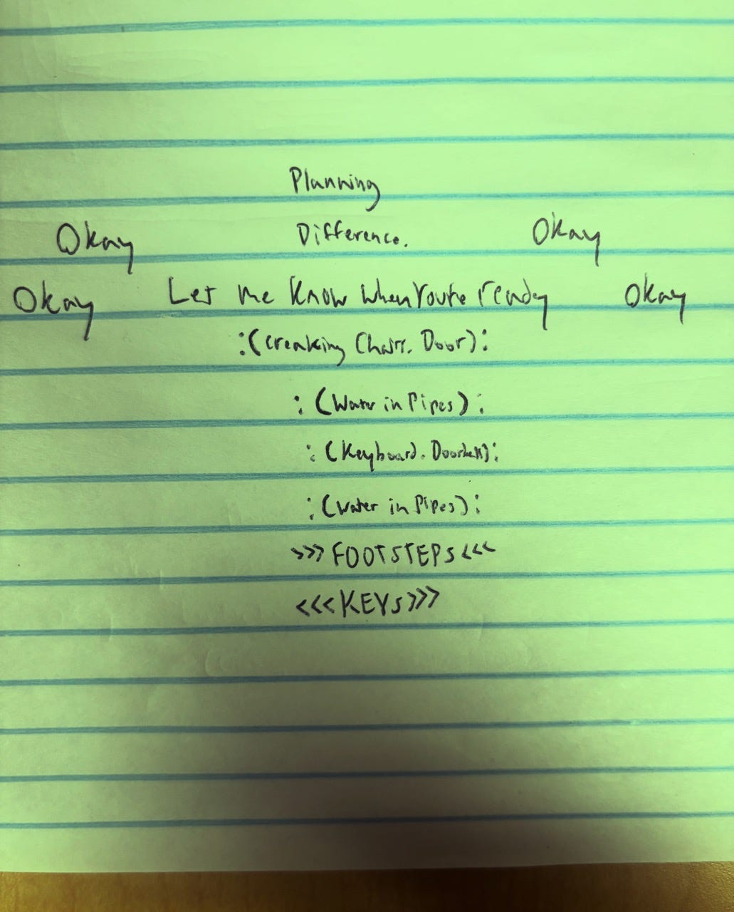 3. The first word or phrase goes in the center. Maybe the second goes under it. Then move to the right, left, and so on. Option to indicate ambient noise and sounds in parentheses or with other marks. Creativity encouraged.